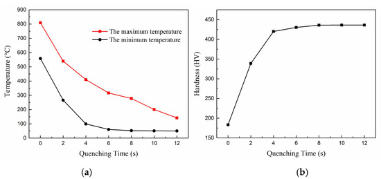 According to the heat transfer theory, when the two contact parts had a temperature difference, the longer contact time happened and the more heat exchange occurred. Therefore, the quenching times were selected from 0 to 12 s in 2 s intervals, the quenching force was 1000 kN, and the punch speed was 80 mm/s. Figure 6a shows the maximum and minimum temperature of the blank with different quenching times after quenching. With the increase of the quenching time, the temperature difference between the blank and dies first increased and then decreased. Since the martensite transformation occurred in a continuous cooling process, the number of martensite transformations stopped once the quenching was stopped. Thus, the maximum temperature of the blank should be below Mf, which means the quenching was completed. According to the FE simulation, after quenching for 8 s, the minimum temperature of the blank was a little higher than Mf. Thus, to guarantee the transformation was completed, the quenching time should have been over 8 s. When the quenching time was over 10 s, the maximum temperature of the blank was below Mf. Figure 6b shows the minimum hardness of the blank with different quenching times after quenching. A significant increase in hardness occurred across quenching times. When the quenching time was 0 s, the martensite transformation of the blank was insufficient and the hardness of the blank was low. When the quenching was over 10 s, the hardness of the blank was high and stabilized. Thus, it was concluded that the quenching force should be above 1000 kN and quenching time should be up to 10 s in these working conditions.
