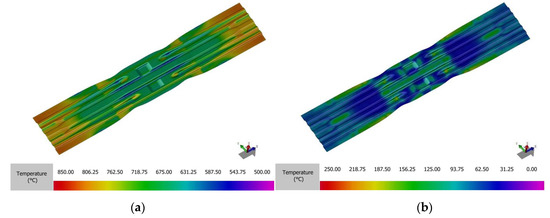 Temperature distribution of the blank before (a) and after quenching stage (b).