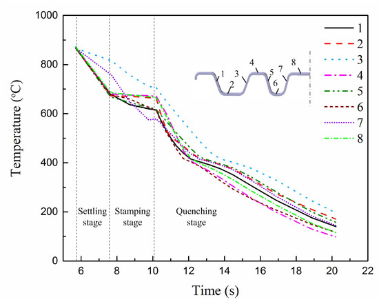 Figure 8 shows the temperature histories of eight nodes in the cross-section of the blank during hot stamping. Before 5.6 s, it was the time for pre-forming and transferring the blank from the furnace to the lower die. The temperature histories in this range were not analyzed. In the settling stage, it was the ram motion that lasted for 2 s. During the hot stamping stage (7.6–10.2 s), the temperature histories of each point were different because of the different contact situations between the upper die and the blank. During the quenching stage (10.2–20.2 s), the cooling rate was rapidly increased because the heat transfer happened with the given quenching force. When the temperature was dropped to Ms, the cooling rate was decreased due to the heat generated by the martensite transformation.