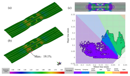 Figure 9a,b shows the thickness distribution of the blank before and after the indirect hot stamping. After forming at room temperature, the minimum thickness of the blank was 1.623 mm. After hot stamping, the minimum thickness of the blank was 1.619 mm. In this case, the blank was thinning due to the second forming during the hot stamping process. The thickness thinning mainly occurred in both left and right sidewalls of the concave-convex, and the maximum thinning occurred at the fillet of the concave-convex in the middle of the blank, which was caused by the large tensile stress that happened at this area during the hot stamping process. According to the studies, a 30% thinning ratio was the threshold in the hot stamping [22,23]. In this FE simulation, the maximum thinning ratio was 19.1%. In the area of sheet metal forming, the forming limit diagram (FLD) signifies an effective tool to characterize the formability of sheet metal materials during the forming process. The FLD reflects the strain state of materials before failure and has been extensively employed to analyze and predict rupture in the course of forming. Figure 9c shows the FLD diagram at the end of forming. There were no points in the red area that indicated that the beam part was in good formability and without cracks.
