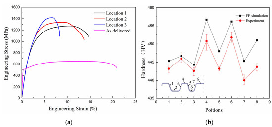 Figure 11a shows the engineering stress-strain curves from each tensile specimen. The tensile strength in different locations showed a little difference but, in general, the mechanical properties of the beam part were greatly improved after the hot stamping process. Figure 11b shows the hardness of the FE simulation and experimental results. The hardness values of the FE simulation were higher than the measured values. This may be due to the oxide layer generated during the hot stamping, which caused smaller heat transfer coefficients. Additionally, owing to the different temperature histories in different positions, the hardness values fluctuated in both simulation and experiment results.