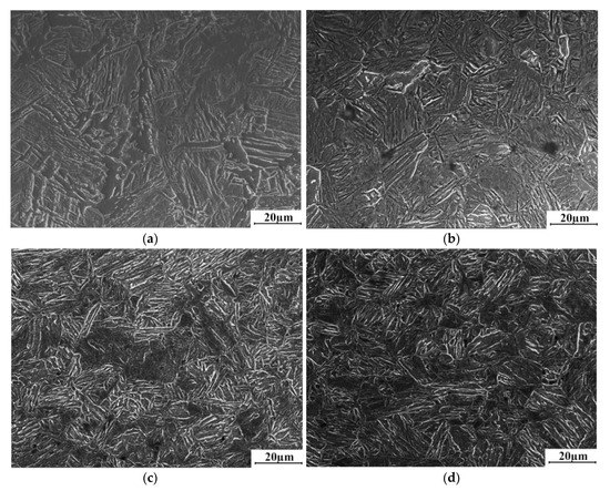 The metallographic observations used a TESCAN VEGA3 scanning electron microscope (TESCAN, Brnocity, Czech Republic). The microstructures of the specimens at middle concave-convex (Figure 11b(4,5,7,8)) of the part are presented in Figure 12. The specimens were polished and etched with a 4% nitric acid alcohol solution for 20 s. It shows that the same phases with different fractions were generated in these four regions. The microstructures were composed of massive lath martensite and a little of ferrite, bainite, and residual austenite. As evident in Figure 12a,b, martensite in the over-plane regions (Figure 11b(4,8)) seemed more slender and uniformly distributed than the sidewall regions (Figure 11b(5,7)). The phase fraction in the left and right sidewall regions (Figure 12c,d) were basically the same. Besides martensite, multiple phases of bainite, ferrite, and residual austenite were found. The microstructure results were consistent with the results of the hardness values. Both left and right sidewall regions of the middle concave-convex could not be fully quenched due to the small quenching force and serious thinning on this area. So, the hardness values and martensite fraction were lower than the over-plane regions. Therefore, due to the inhomogeneity of the microstructure, some regions reflected the scattering in hardness values.