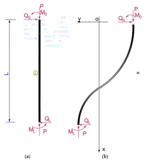 First, the basic formula for the compression rod bending should be derived. A straight compression rod with equal sections was taken out from the elastic structure, and any constraints were imposed at both ends, so that there were the axial force, shear force, and bending moment on the end section, as shown in Figure 2. In the figure, the original vertical position without the load was presented by the straight line, while the new balanced position under the load was shown by the curve [8,9].