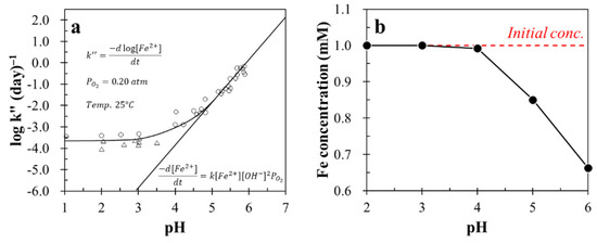 - Morgan, B.; Lahav, O. The effect of pH on the kinetics of spontaneous Fe(II) oxidation by O2 in aqueous solution–basic principles and a simple heuristic description. Chemosphere 2007, 68, 2080–2084. [Google Scholar] [CrossRef] [PubMed]