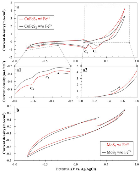 - The CV results indicated that Fe2+ oxidation can occur on the chalcopyrite surface, but not on the molybdenite surface, due to their different electrical properties.