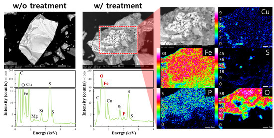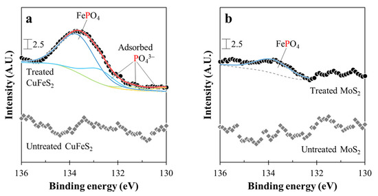 - After microencapsulation treatment using Fe2+ and PO43−, SEM-EDX and XPS analyses confirmed that chalcopyrite was more coated with FePO4 than molybdenite.