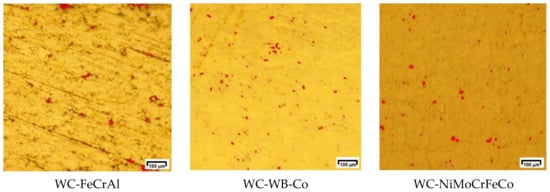 These measurements clearly show that the porosity of metallic–ceramic coatings, in addition to the technological parameters of coating spraying, depends on their hardness. However, this does not apply to alloy coatings, for which the mechanism of coating formation is different. It has been stated that the porosity values of the coatings applied by HVOF technology do not exceed 1%, which was confirmed for the evaluated coatings. The different porosity of the evaluated coatings was due to the different matrices, the type and distribution of hard carbide particles in the matrix, and the volume fraction of particles in the matrix. Our experiment demonstrated the high quality of coatings applied by HVOF technology.