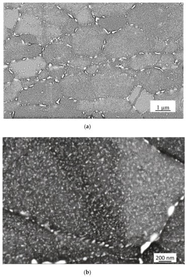 The microstructure of the samples has been characterized by means of a scanning electron microscope SEM-FEG (SEM FEG LEO 1550 ZEISS McQuairie, London, UK) equipped with an EDS OXFORD X ACT system (v2.2, Oxford Instruments, Abington, UK). MgZn2 phase forms both along grain boundaries and inside the grains (see Figure 1a,b). The image in Figure 1a shows particles of ~200–300 nm along grain boundaries while finer precipitates of ~10–20 nm in the grain interior are evidenced in (b). Through the image analysis of ten micrographs taken at the same magnification of that in Figure 1b, a mean distance between the nanometric precipitates inside the grains of ~30 nm was determined. The image processing and quantitative analysis has been performed by using the software IMAGE-J Fiji 1.46 (National Institute of Health, 20892 Bethesda, Rockville Pike, MD, USA).
