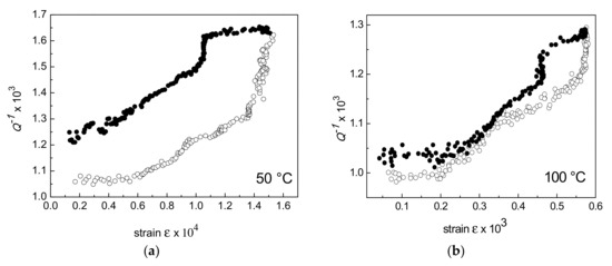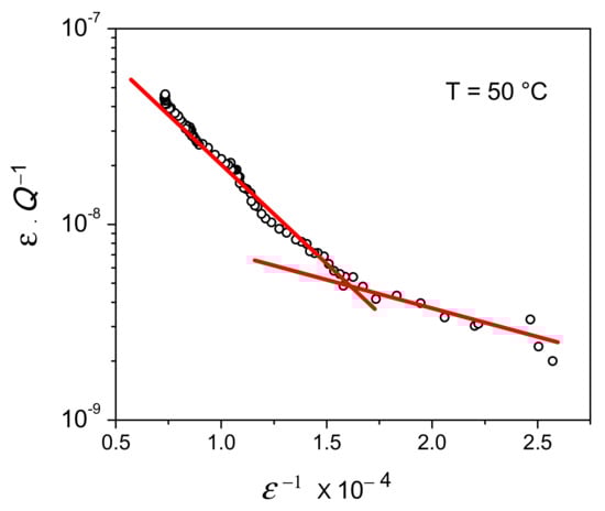 According to Equation (5), the GL plot, i.e., log (ε.Q−1D) vs. ε−1, should exhibit a linear trend, however this is not observed in present experiments. For example, Figure 4 shows the GL plot of a sample tested at 50 °C which substantially exhibits two different slopes. On the other hand, it is evident that all the curves in Figure 3 do not have a simple exponential trend.