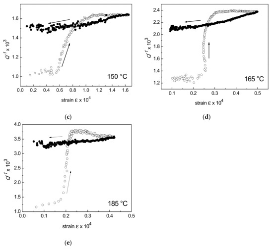 Isothermal MS tests provided internal friction (Q−1) vs. strain (ε) curves at different temperatures. Figure 3 shows the curves obtained in test runs at 50, 100, 150, 165 and 185 °C; open circles indicate the values measured during the stage at increasing strain, solid circles at decreasing strain. In the first stage of all the curves Q−1 progressively increases with strain and exhibits a sharp slope change in corresponding of a critical strain. In general, damping can be considered as the sum of two contributions, one independent (Q−1I) and the other one dependent on the strain (Q−1D):