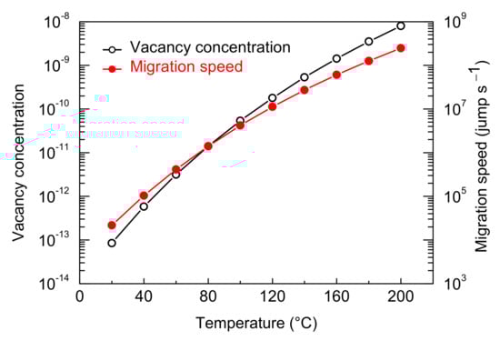 Vacancy concentration and migration speed vs. temperature in the range of MS experiments.
