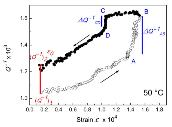 Another relevant aspect of the curves in Figure 3 is that after a complete test run (increasing and decreasing strain) the final damping value (Q−1)2 is always higher than the initial one (Q−1)1. To highlight this phenomenon, the case of the curve obtained by testing the alloy at 50 °C is examined in detail in Figure 6.