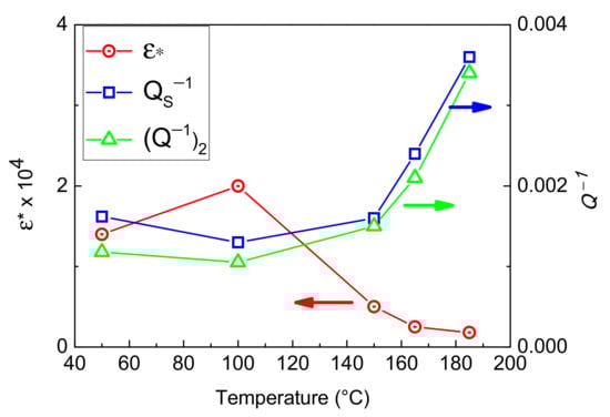 Another effect of temperature is to enhance both the damping saturation, which passes from ~1.6 × 10−3 for tests at 50 °C to ~3.7 × 10−3 at 185 °C, and the final value (Q−1)2. These results are shown in Figure 8.
