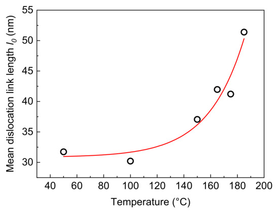 The mean link length l0 of dislocation segments after MS test cycles at different temperatures has been calculated through Equations (10) and (11) by considering the dislocation density, resonance frequency and (Q−1)2 values reported in Table 4. The results are plotted vs. test temperature in Figure 9.