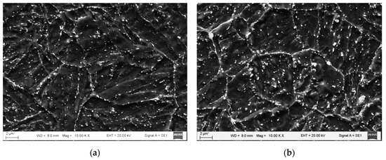 SEM (CARL ZEISS MICROSCOPY LIMITED, Cambridge, UK) microstructure of the P91 steel in the as-received condition (a) and after 11,000 h of ageing at 650 °C (b).