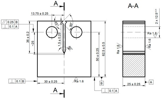 An Instron Model 8801 test machine (Instron limited, Buckinghamshire, UK) was used for testing the mechanical properties and fracture toughness of steel P91. Room temperature tensile tests were carried out according to EN ISO 6892-1 [14] requirements and elevated temperature tests were carried out according to EN ISO 6892-2 [15] requirements. The cylindrical specimens with a threaded shoulder were selected for this research. The diameter of specimens for the testing was 8 mm and gauge length was 40 mm. The fracture toughness experiments were carried out according to the ASTM E399 [16] standard. The compact tension C(T) specimens were selected for this purpose. The drawing of manufactured specimens for fracture toughness testing is shown in Figure 2.