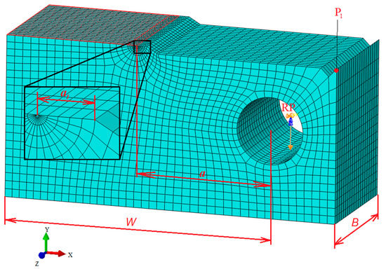Reference points (RPs), which were placed in the centre of the pin hole of the specimen model, was used for the boundary conditions. The displacement along X and Z axis and rotation around the Y axis were restricted for the RP point. However, the translation of the RP point along the Y axis was used as a load. In order to evaluate large strains at the front of the crack the option for nonlinear geometric effects Nlgeom [17] was selected. The numerical model has yielded the following results: reaction force at the RP point, crack mouth opening displacement (CMOD), stress intensity factor and J-integral at the crack front. CMOD was measured by tracking the position of point P1 (see Figure 4) in the Y direction (point P1 is situated on the specimen edge where an extensometer is attached in the experiment).