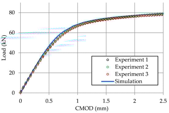 As described in the methodology (see Section 3.1) tension load vs. CMOD curves were determined after simulation. Non-linear tension simulation with elastic-plastic material properties was used for this purpose. The comparison of experimental and numerical simulation results for not aged material at 20 °C is presented in Figure 6. The figure shows three experimentally determined curves and a curve determined by numerical simulation. As can be seen, experimental results are very close. According to Figure 6 the numerically determined curve quite well matches the curves determined experimentally, where the highest deviation of results is less than 5%.