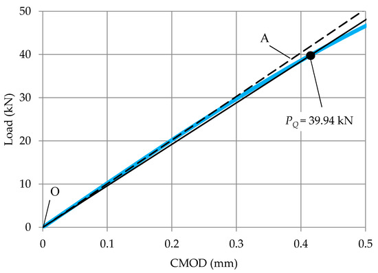 When the load vs. CMOD curves are determined PQ and Pmax loads can be found. These loads were determined using ASTM E399 procedures [16] as described in Section 3.1. As an example, the determination of the PQ load for not aged steel at room temperature is shown in Figure 7.