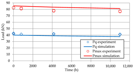 The fracture toughness was investigated after a long-term exposure of P91 steel at 650 °C temperature. To evaluate the ageing impact on the fracture toughness of the P91 steel it was calculated for several specimens with different ageing time. The numerical simulation was carried out at room temperature and the determined results were compared with the experiment data. Numerically and experimentally determined PQ and Pmax loads are presented in Figure 10. According to the data ageing of the steel does have an influence and the biggest effect is for the Pmax load. The highest deviation of numerically simulated results comparing to the experiment data was up to 9% and it was received for the specimen aged for 11,000 h. In general, simulation results are in good agreement with the experiment.