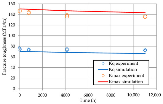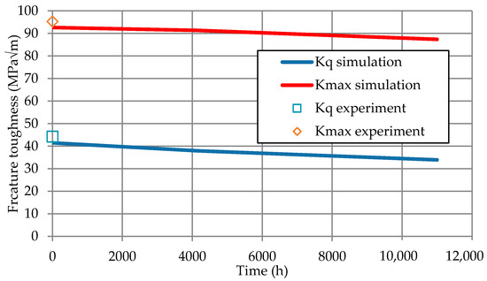Experimentally and numerically determined KQ and Kmax values at room temperature for as-received and aged materials are presented in Figure 11. According to the figure, with an increase of the ageing time both fracture toughness values are decreasing. Comparing numerical and experimental results it can be seen, that at all ageing time points numerically determined KQ values are lower and Kmax values are higher than experimentally determined values. However, the difference between numerical and experimental results is not large, where the highest deviation is less than 9%. The decrease of fracture toughness after an ageing time of 11,000 h is not significant, where experimentally determined KQ and Kmax values decreased respectively by 4% and 7% and numerically determined values decreased by 6% and 5%.