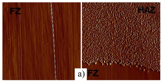 Surface morphology of the FZ and HAZ: (a) 2D image, (b) 3D image made by atomic force microscopy (AFM) with X-ray diffraction pattern [43] (with the permission of Polish Academy of Sciences).