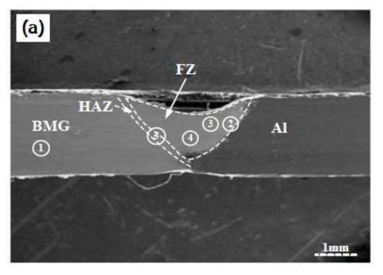 Xiaoquan Yu et al. studied the laser-welding process of Zr-based bulk amorphous alloy with a 1100 aluminum alloy plate [55] as well as a copper plate [56]. The microstructure and chemical composition of the joint were analyzed using SEM and XRD, and the results are shown in Figure 10. The results show that the amorphous base-material maintained the amorphous structure, while Zr2Ni and Zr2Al phases appeared in the melting zone, the heat affected zone, and the junction between the melting zone and the aluminum alloy plate. The hardness test showed that the Vickers hardness of the joint exceeded that of the amorphous base-material, and the maximum hardness occurred at the junction of the aluminum plate with the welded joint. In the welding samples of Zr-based metallic glass and copper plate, both the molten zone and the amorphous base material zone maintained an amorphous characteristic. However, a crystalline phase of Zr and Cu appeared at the junction of the molten zone with the copper plate. The hardness of the amorphous structure in the molten zone was improved compared to the amorphous base material. The research results above confirm the feasibility of laser welding of amorphous alloys with crystalline metals. The hardness of the welded sample joint was improved compared to the parent material, which represents a new approach to extend the range of industrial applications for amorphous alloys.
