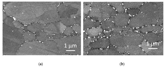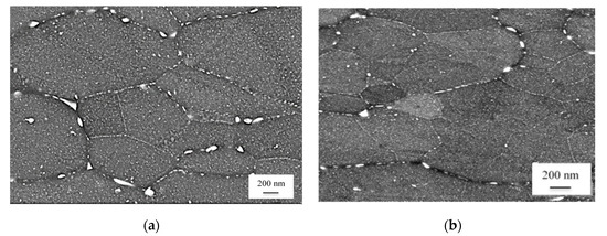 Warm upsetting temperature effect on the AA7050 alloy microstructure. (a) Warm upsetting temperature = 293 K, average Dg = 10.1 μm and (b) warm upsetting temperature = 473 K, average Dg = 7.5 μm (SEM-FEG images at 20 KX magnification).