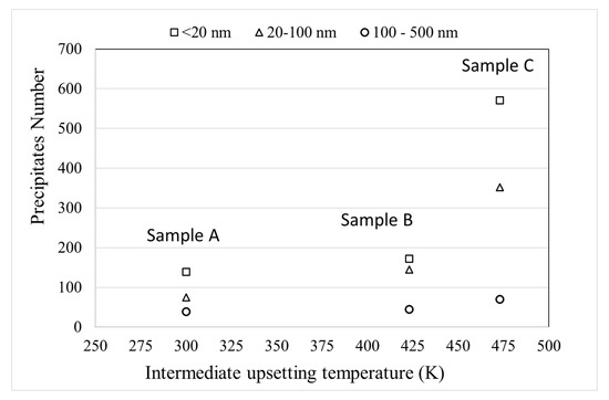 The number of detected precipitates as a function of intermediate upsetting temperature is reported in Figure 4, grouped for different precipitate size ranges.