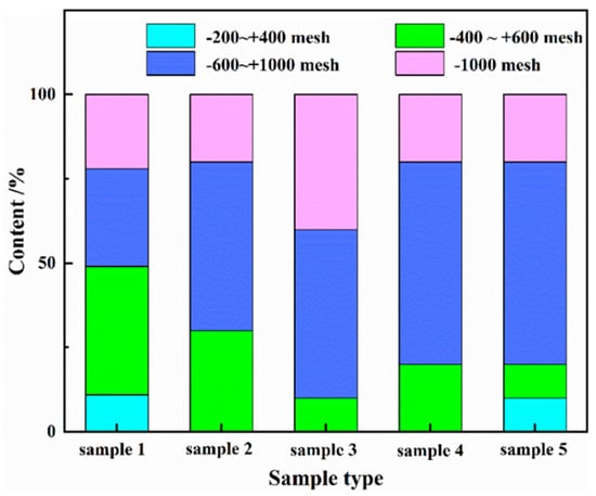 The hysteresis loss strongly depends on the coercivity of the alloy and the density of SMPCs [5,8,13]. Several researchers have tried to reduce the coercivity of the Fe-6.5 wt%Si alloy by doping Ti and Co [14,15]. Doping moderate specific elements may improve the internal microstructure of Fe-6.5 wt%Si alloy to reduce the coercivity. In addition, some authors have attempted to increase density of SMPCs by increasing pressure or using different methods of compaction [13,16,17]. However, when the forming pressure reaches the marginal value, the magnetic performance of cores will not be obviously improved even if the pressure continues to increase. Therefore, some works on increment density by adjusting powder particles size distribution. It is demonstrated that the dimensions, purity, and size distribution of the magnetic particulate has tremendous influences on the microstructure and electromagnetic performance of the powder cores [18,19]. Some authors investigated the influence of the particle size of the powder on the core’s magnetic properties [20,21]. Nevertheless, little attention has been devoted to the effect of particle size distribution on hysteresis loss, eddy current loss, and permeability of SMPCs. In this work, Fe-6.5 wt%Si SMPCs with excellent comprehensive magnetic performance were prepared by particle size optimization engineering. Phosphate and epoxy resin were selected as the insulating layer and binder, respectively. The influences of the different particle size distribution of powders on the microstructure, hysteresis loss, eddy current loss, and permeability of SMPCs were investigated in details.