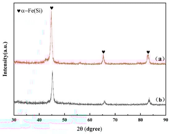 XRD pattern of (a) the raw Fe-6.5 wt%Si powders and (b) the coated Fe-6.5%Si powders.