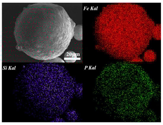 In order to achieve excellent comprehensive magnetic properties of magnetic cores and considering economic applicability, we actually made multiple particle size distribution of magnetic cores, as shown in Figure 1. Finally, five typical SMPCs were prepared to analysis the microstructure and magnetic properties. Figure 4 shows the fracture morphology of Fe-6.5 wt%Si SMPCs with different particle size distribution. It can be seen that the microstructure of the cores is composed of different sizes of metal powder and air gaps, which form a tight network structure. According to Figure 4a, the internal pores between Fe-6.5 wt%Si powder with larger diameter are filled as the Fe-6.5 wt%Si powder with smaller diameter, which leads to high density. In the light of Figure 4b,c, however, increase in the content of fine powder makes the fine powder agglomerated and creates more air gaps at the microlevel, and consequently, the density of SMPCs decreases from 6.4 to 6.2 g/cm3. By changing the particle size distribution as 10%, 10%, 60%, and 20% for particles groups of A–D, most of the internal pores are filled. Hence, the density of the Fe-6.5 wt%Si SMPCs increases from 6.2 to 6.52 g/cm3, as shown in Figure 4f. Figure 5 shows the SEM image of the Fe-6.5 wt%Si powder after phosphating and the corresponding EDS spatial elemental mapping of the powders. The Fe-6.5 wt%Si powder surface was rough than the untreated powders and produced a flocculent phosphate coating. It was further confirmed by EDS that the surface of power formed uniform and continuous phosphate coating, which means that the phosphating layer is homogeneously coated on the surface of the Fe-6.5 wt%Si powder. Compared with the thick and messy coating layer, the uniform and dense layer has smaller obstacle to the rotation of the magnetic domain, which is beneficial to reduce the hysteresis loss