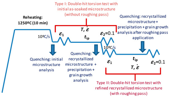 To study their hot deformation and microstructural evolution behavior, different types of torsion tests were performed. The specimens were a reduced central gauge section of 16.5 mm in length and 7.5 mm in diameter. A schematic representation of the thermomechanical schedule used in the tests is shown in Figure 1. In all cases, a soaking treatment was applied at 1250 °C for 10 min. To determine the softening kinetics, double-hit torsion tests were carried out. In some of the tests (type I in Figure 1), after reheating, the samples were cooled directly to the deformation temperature, where two deformation passes ( and = 0.1) with different interpass times () between them were applied. In the rest of the tests (type II in Figure 1), a roughing deformation pass with = 0.35, = 1s−1 was first applied at 1100 °C, followed by a holding time that was determined to result in a fully recrystallized microstructure. The aim was to obtain refined initial austenite microstructures, more representative of those present during hot rolling. In the double-hit tests, both deformation passes were applied at constant temperature and strain rate conditions. The range of deformation parameters used was: from 0.1 to 0.35, strain rate from 1 s−1 to 5 s−1 and deformation temperatures from 1150 °C to 850 °C. The fractional softening was determined using the 2% offset method, which is reported as the method that most accurately excludes the effect of recovery in the absence of strain- induced precipitation [31,32].