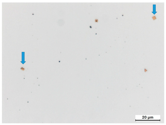 The presence of coarse undissolved precipitates was first analyzed using optical microscopy in the high Ti specimens quenched for initial microstructure analysis. An example of the micrographs obtained for the Ti5Nb3 steel is shown in Figure 2. A significant number of coarse particles, in the size range of µm, can be detected. While some correspond to inclusions, precipitates containing Ti can be distinguished in the micrograph due to their characteristic orange contrast (see particles marked with arrows). The optical micrographs obtained for the rest of the high Ti steels showed similar features, and no significant differences were observed between the Ti5Nb3, Ti10Nb3 and Ti15Nb3 samples regarding precipitate amount or size.