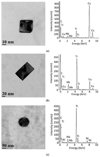 Strain-induced precipitates detected in the carbon replicas after deformation at 900 °C and corresponding EDS analysis (tests performed with roughing, = 0.35, = 1 s−1 and 100 s holding time). (a) Ti0Nb3 steel, D = 7.2 ± 0.2 nm, (b) Ti10Nb3 steel, D = 15.0 ± 0.4 nm, (c) Ti15Nb3 steel, D = 16.0 ± 0.5 nm.