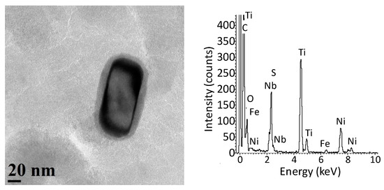S-, Nb- and Ti- containing precipitate found in the carbon replicas extracted from the Ti10Nb3 specimen quenched for initial microstructure analysis.