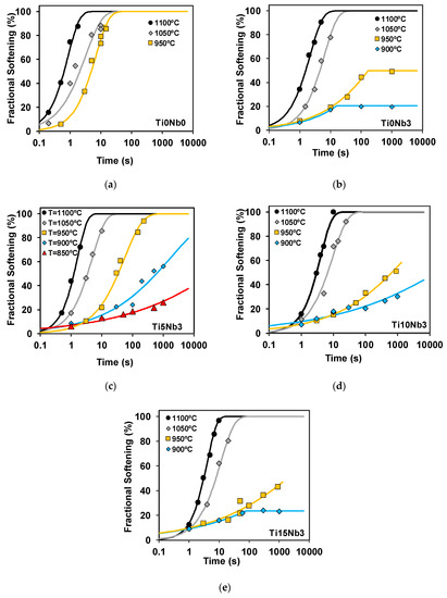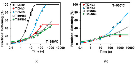where is the fractional softening corresponding to a time , is the time to reach a 50% fractional softening and is the Avrami exponent. At lower temperatures, the behavior varies depending on the steel considered. For the Ti0Nb3 steel at 950 °C and 900 °C (Figure 6b) and for the Ti15Nb3 steel at 900 °C (Figure 6e), softening stagnations, or plateaux, which are usually related to the onset of strain-induced precipitation [2,23], are detected. In the rest of the cases, although a larger softening retardation is observed relative to higher temperatures, the softening increases continuously as the interpass time increases within the time range investigated.