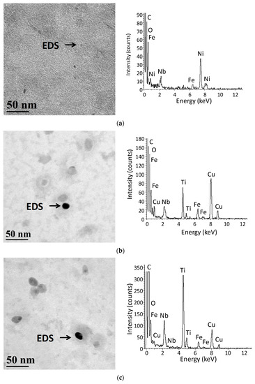 Figure 11 shows examples of the precipitation state and an EDS analysis observed for the 100 s condition for the three steels. Additionally, while very fine Nb-containing precipitates (D = 7.2 nm) were detected for the Ti0Nb3, for both the Ti10Nb3 and Ti15Nb3 steels, the precipitates were coarser (D ≅ 15–16 nm) and both Nb and Ti could be clearly detected in their composition. It must be mentioned that in carbon extraction replicas the smallest precipitates may not be extracted [12], although in the case of Figure 11a precipitates as small as 3.3 nm have been measured.