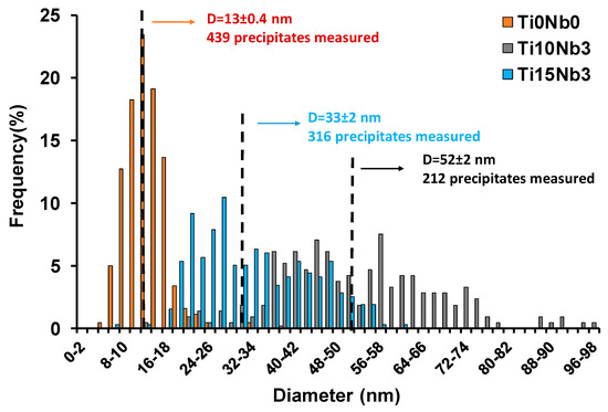 Precipitate size distributions measured for the Ti0Nb3, Ti10Nb3 and Ti15Nb3 steels in samples quenched after deformation at 900 °C (roughing pass applied, = 0.35, = 1 s−1) and 1000 s holding time.