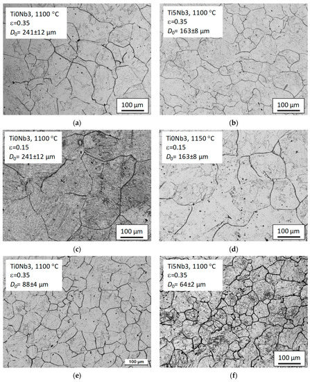 Figure 13 shows examples of the recrystallized microstructures obtained from the Ti0Nb3 and Ti5Nb3 steels at = 1100 °C and 1150 °C, = 1 s−1 in specimens quenched at . The micrographs were obtained after reheating and applying different deformation conditions: a single deformation pass of ε = 0.35 at 1100 °C in the case of Figure 13a,b, a single deformation pass of ε = 0.15 at 1100 °C–1150 °C in Figure 13c,d, and a roughing pass plus a deformation pass of ε = 0.35 at 1100 °C in Figure 13e,f. As expected, equiaxed austenite microstructures are obtained in all cases. When considering the effect of deformation conditions, similar behavior is observed for both steels: the application of a single deformation pass of ε = 0.35 leads to significant microstructural refinement of the initial as-soaked microstructure (from 241 to 88 μm for Ti0Nb3 and from 163 to 64 μm for Ti5Nb3). On the other hand, when a lower strain level of ε = 0.15 is applied, for both steels the grain size remains approximately constant or even slightly increases for the Ti0Nb3 steel. Finally, the application of another ε = 0.35 deformation pass also results in some grain size refinement (from 88 to 65 μm for the Ti0Nb3 and from 70 to 56 μm for the Ti5Nb3 steel), although the effect is less marked than when the coarser as-soaked microstructure was deformed.