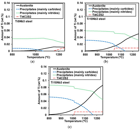 Amount of Ti (wt.%) in each of the phases at equilibrium conditions calculated with Thermo-Calc software [34,35] for the high Ti steels. (a) Ti5Nb3, (b) Ti10Nb3, (c) Ti15Nb3.