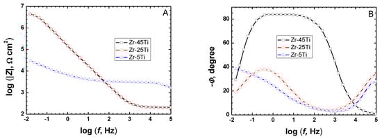 These SECM observations, depicting electrochemical heterogeneity and local passivity breakdown on the surface of Zr-45Ti, apparently contradict the higher corrosion resistance exhibited by the Ti-enriched alloy from conventional averaging electrochemical (impedance) measurements. The developed oxide layer has shown to be equally or more inert in thermally oxidized Zr-45Ti, compared to Zr-25Ti and Zr-5Ti, when exposed to phosphate buffer saline solution at 37 °C (this work), neutral Ringer’s solution at 37 °C [