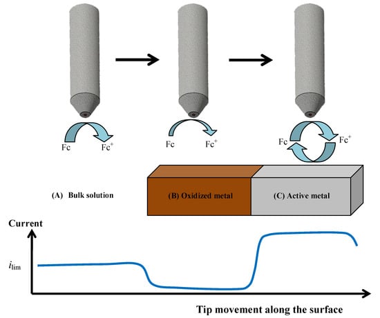 Figure 3A). When this reaction is performed in the proximity of the flat surface of the oxidized Zr-Ti alloy sample, either the material will block the diffusion of the redox mediator towards the tip (that is, negative feedback at an insulating substrate, see