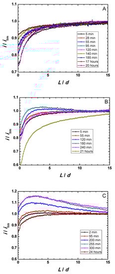 Z-approach curves do not display the actual positive feedback behavior characteristic of conductive surfaces, as there was not a steady growth of the normalized current as the tip approached the substrate, ideally increasing towards infinite for normalized tip–substrate separations tending to zero. Instead, a mixed behavior between those corresponding to positive and negative feedback effects is observed. That is, as the tip traveled towards the substrate from the bulk of the electrolyte, the proximity of the surface was first noticed from the increase in the normalized current related to partial conductivity, and then eventually changed towards smaller normalized currents in the vicinity of the substrate. In addition, probe-approach curves measured after 3–5 h immersion for Zr-45Ti depict a continuous increment of the tip current at relatively large distances (i.e., 10 to 15 times the diameter of the Pt microdisk), with the same slope maintained until ca.