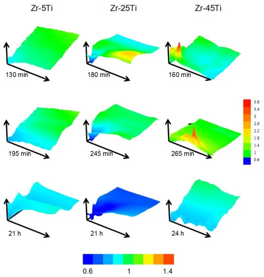 d = 10 µm). Results show that the behavior of the surfaces was primarily insulating, although dynamic evolution occur in all samples. The measured currents were observed to slightly increase within the first 3–5 h immersion, attaining maximum ranges after 140, 180, and 300 min immersion for the Zr-5Ti, Zr-25Ti, and Zr-45Ti specimens, respectively. After sufficiently long exposure (i.e., 20–24 h immersion), the surfaces became more insulating, directly related to thickening of the oxide-hydroxide layer formed on the surface of the alloys exposed to the aqueous environment. This feature is clearly observed from the general trend towards smaller normalized feedback currents measured at the tip located in the vicinity of the substrate (i.e., for small normalized tip–substrate separations) occurring for the longest immersion times in all cases.