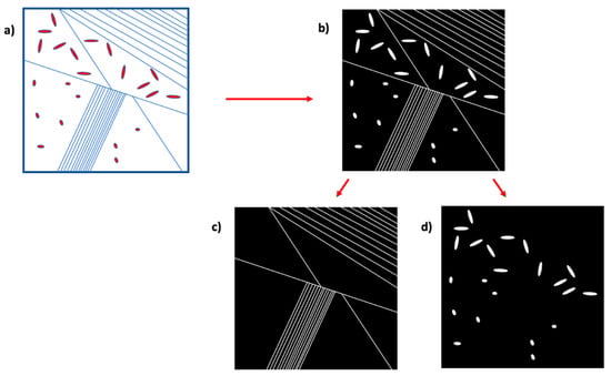 (a) Binary image of SEM micrograph in Figure 3. (b,c) were segmented from (a) using an appropriate threshold value of 30 pixels. (b) Binary image of the grain boundaries (pixels ≥ 30). (c) Binary image with only the precipitates (pixels < 30).