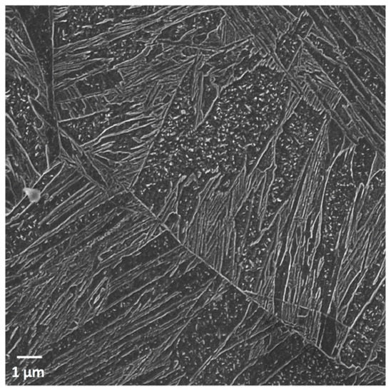 Cross-sections from the heat-treated cylindrical specimens were cut transverse to the long axes of the cylinders at the position of the control thermocouple. It was found previously [2] that hot mounting auto-tempered martensitic steel samples induces additional tempering. To prevent this, the samples were cold mounted with an epoxy resin (Struers EpoFix Resin, Struers ApS, Ballerup, Denmark) mixed with a hardener (Struers EpoFix, Struers ApS, Ballerup, Denmark), cured and left to harden for 24 h. The mounted samples were polished to a mirror finish using 0.04 µm colloidal silica, and subsequently etched with a 2% Nital solution. The microstructures were examined with a field emission scanning electron microscope (FE-SEM) (Zeiss Sigma, Carl Zeiss AG, Oberkochen, Germany) using a 5 kV acceleration voltage and an InLens secondary electron detector.