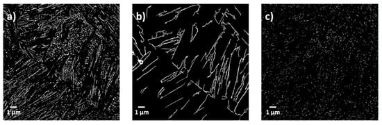 The micrograph in Figure 3 was grayscaled, where the pixels at grain boundaries and precipitates have high intensities while the pixels in the martensite matrix have lower intensities. Binarization of the SEM image was performed by applying a threshold to the intensity values to ensure that the non-matrix features were positive while the background was zero, as shown in Figure 4a. Further, the larger features, such as grain and lath boundaries (Figure 4b), were separated from the smaller sized precipitates (Figure 4c), as described in Section 2.