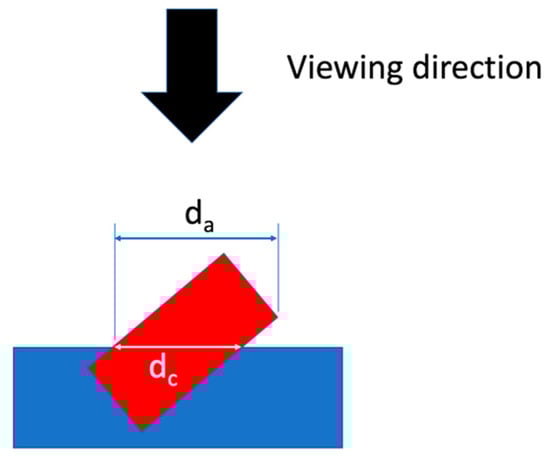 The combined effect of two factors explain the overestimation: (1) Some rod-shaped cementite particles can be smaller than the pixel size used and (2) cementite precipitates are embedded within the martensitic matrix irregularly, which leads to them sticking out from the etched surface at various angles, as shown in Figure 5. This makes the dimension relevant for calculating the area (and volume) fraction i.e., as seen in Figure 5, “dc” appears as the larger size “da”. The finite size of the electron beam produces a secondary electron (SE) signal outside the center-point of the beam, which increases the apparent size of small objects, ultimately defining the resolution limit of the microscope. Non-metallic inclusions were not a problem in our sample due to the cleanness of the steel.