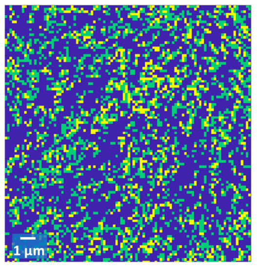 - The image of the precipitates were further processed by dividing it into a matrix of equi-sized boxes (100 by 100 boxes). The ratio of white pixels to the total number of pixels in each box was calculated, and depending on the ratio, the region was designated a particular color indicating the local area fraction of auto-tempered carbides, as shown in Figure 2. The highly auto-tempered regions (yellow) were designated as those in which the apparent area fraction of the auto-tempered carbides within a given box exceeded 10%. The regions showing a low local area fraction of auto-tempered carbides were those in which box area fractions were in the range 1–10% (green). Boxes showing area fractions less than 1% were designated non-auto-tempered (blue).